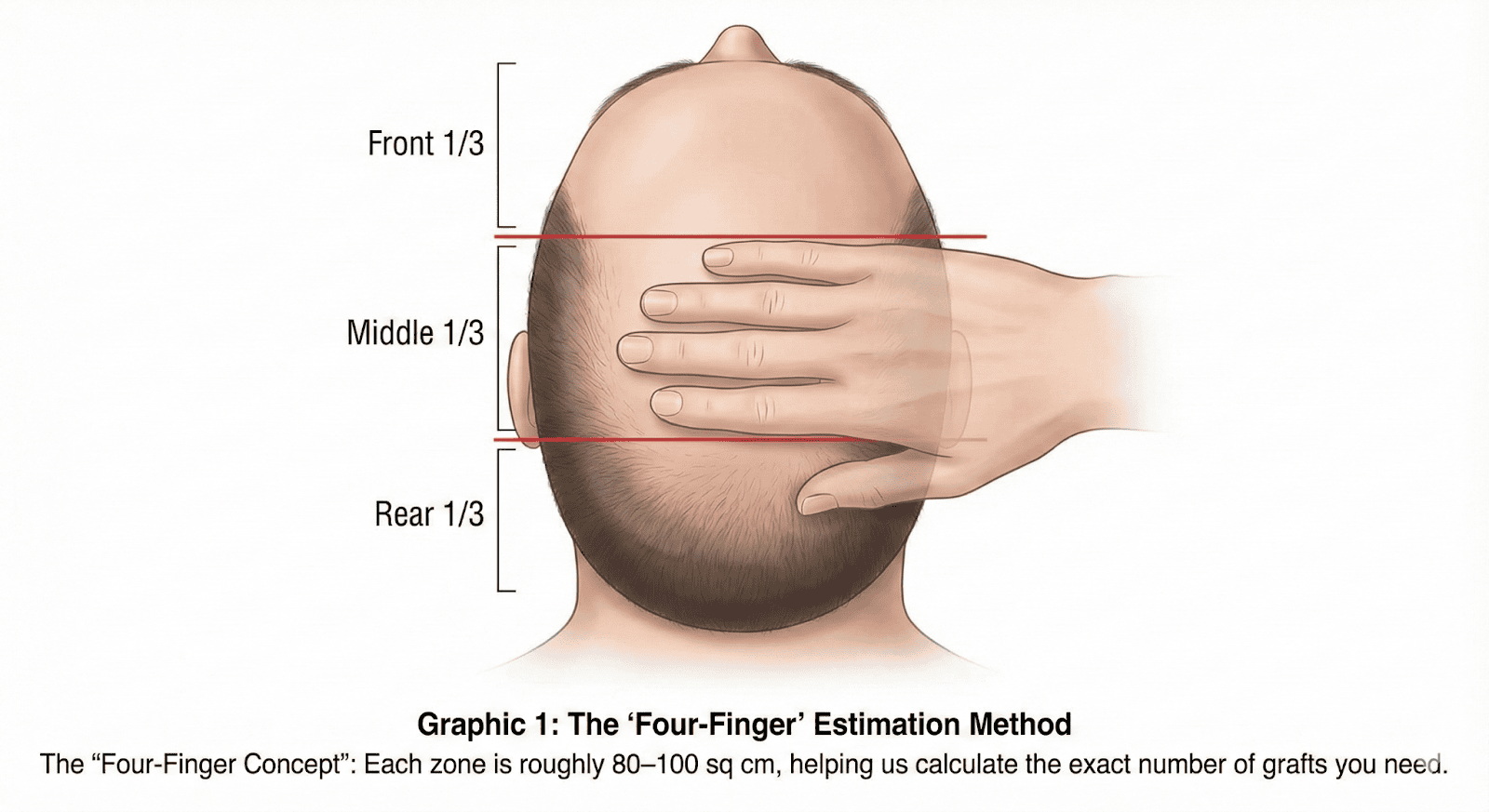 The "Four-Finger" Concept: For a quick assessment, we often divide the scalp into thirds (frontal, middle, and rear), each roughly the width of a four-finger hand (approximately 80–100 sq cm), to visualize the donor demand.