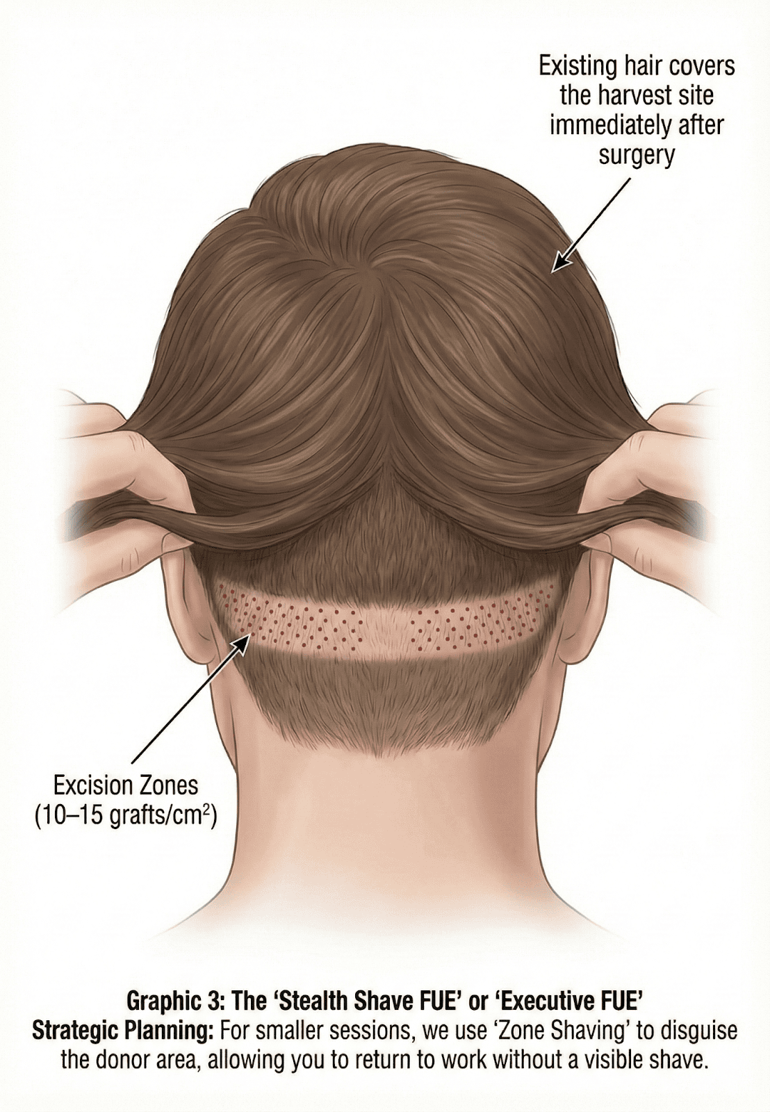 Future-Proofing: We generally place the first harvest in the "upper third" of the safe donor zone. This preserves the lower hair for future sessions and ensures the scar remains hidden even if you age into further recession.